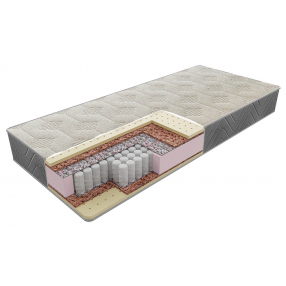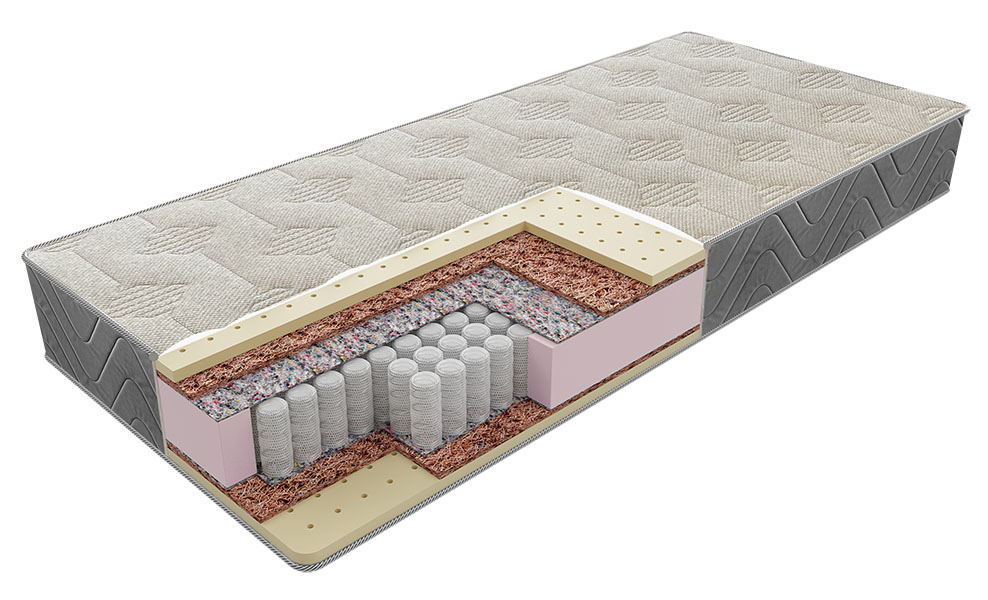 Матрасы этой модели изготовлены из натурального латекса и латексированной кокосовой койры. Такое сочетание материалов наполнения мягкого слоя матраса гарантирует комфортный и продолжительный сон. Блок независимых пружин «PS 500» обеспечивает поддержку и правильное положение позвоночника. Матрас создан для людей, ведущих активный образ жизни. Чехол - Elite Натуральный перфорированный латекс Латексированная кокосовая койра Прокладочный материал - Термовойлок Пружинный блок - PS 500 Прокладочный материал - Термовойлок Чехол - Elite